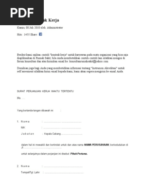 Contoh Surat Kontrak Pekerja from www.portalmalaysia.com Draft contoh surat perjanjian kerjasama usaha, jual beli tanah dan rumah, sewa menyewa, hutang piutang, kontrak kerja dan perjanjian lainnya. Contoh surat kontrak kerja yang sering diterapkan di indonesia adalah perjanjian kerja waktu tertentu (pkwt) dan perjanjian kerja waktu tidak tertentu (pkwtt). Dalam beberapa artikel sebelumnya kami membahas tentang beberapa contoh aplikasi kerj. Demikian artikel tentang contoh perjanjian kontrak kerja yang baik dan benar ini, semoga bermanfaat dan dapat menjadi referensi dalam membuat surat yang. Saat masuk bekerja di sebuah perusahaan pertama kali sebelumnya pasti anda menandatangani kontrak kerja. Berikut contoh surat kontrak kerja rangkuman jurnal manajemen yang dapat dijadikan referensi bagi para pengusaha maupun calon karyawan yang akan memulai sebuah karir download contoh surat perjanjian kontrak kerja karyawan swasta . Membuat contoh surat kontrak kerja tidak sulit karena yang terpenting anda tahu apa saja persyaratan atau perjanjian yang akan anda tulis dalam surat tersebut.